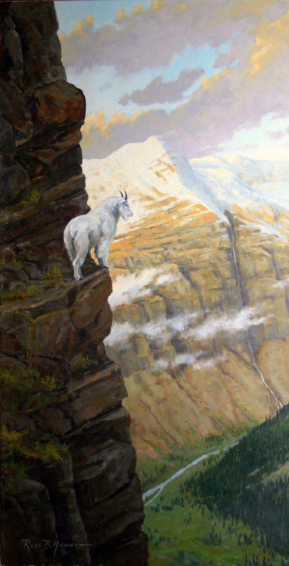 While traveling through western Canada I saw a number of Mountain Goats, fearless creatures that traverse sheer cliffs with ease. While I observed them from far below the artist in me imagined what it must be like in their world.